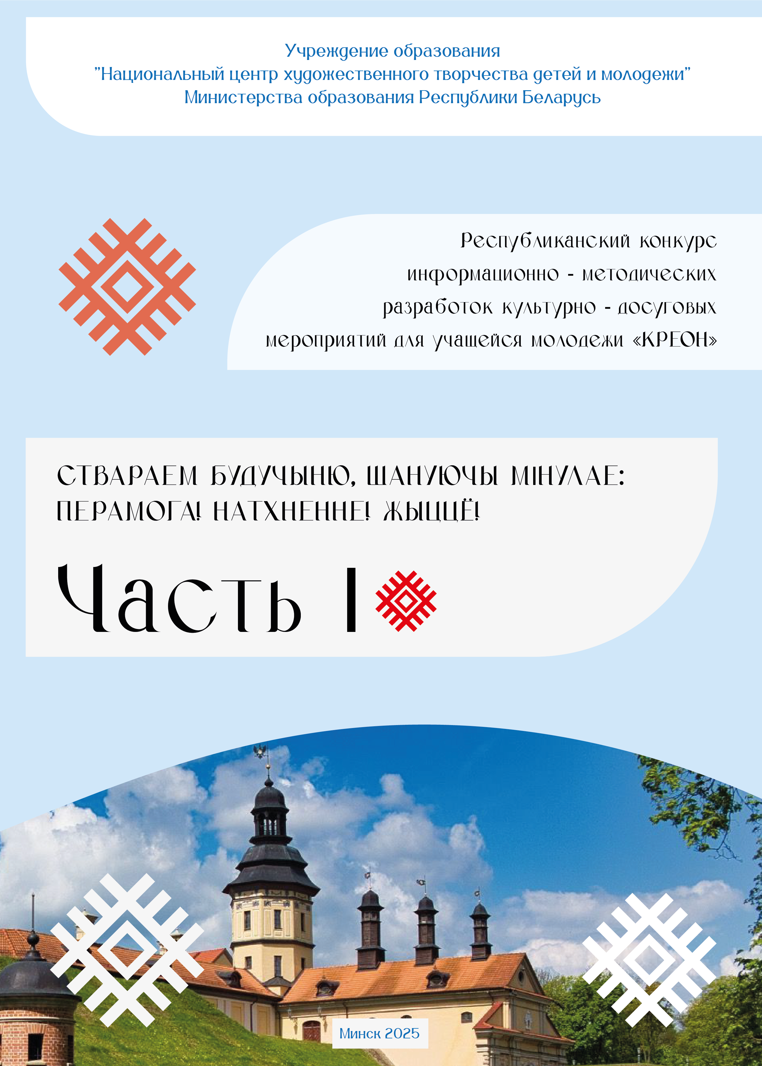 «СТВАРАЕМ БУДУЧЫНЮ, ШАНУЮЧЫ МIНУЛАЕ: ПЕРАМОГА! НАТХНЕННЕ! ЖЫЦЦЁ» : информационно-методический сборник: в 2 ч. / сост. В.В. Новицкая, Д.А. Медвецкая. – Минск: НЦХТДМ, 2025. – Ч.1. – 194 с. В сборнике представлены разработки культурно-досуговых мероприятий – конкурсные, информационные, инновационные интерактивные и праздничные программы, проведенные в учреждениях профессионально-технического и среднего специального образования. Творческие разработки включают результаты изучения учащимися народной культуры своего региона, демонстрируют опыт популяризации в молодежной среде духовного наследия малой родины, образцы художественно-творческой деятельности в освоении фольклора, практики концертно-творческих выступлений коллективов учащихся для земляков – жителей агрогородков и малых населенных пунктов. Данный сборник будет интересен специалистам, обеспечивающим воспитательные практики с учащейся молодежью, руководителям творческих объединений учащихся. Читать онлайн |