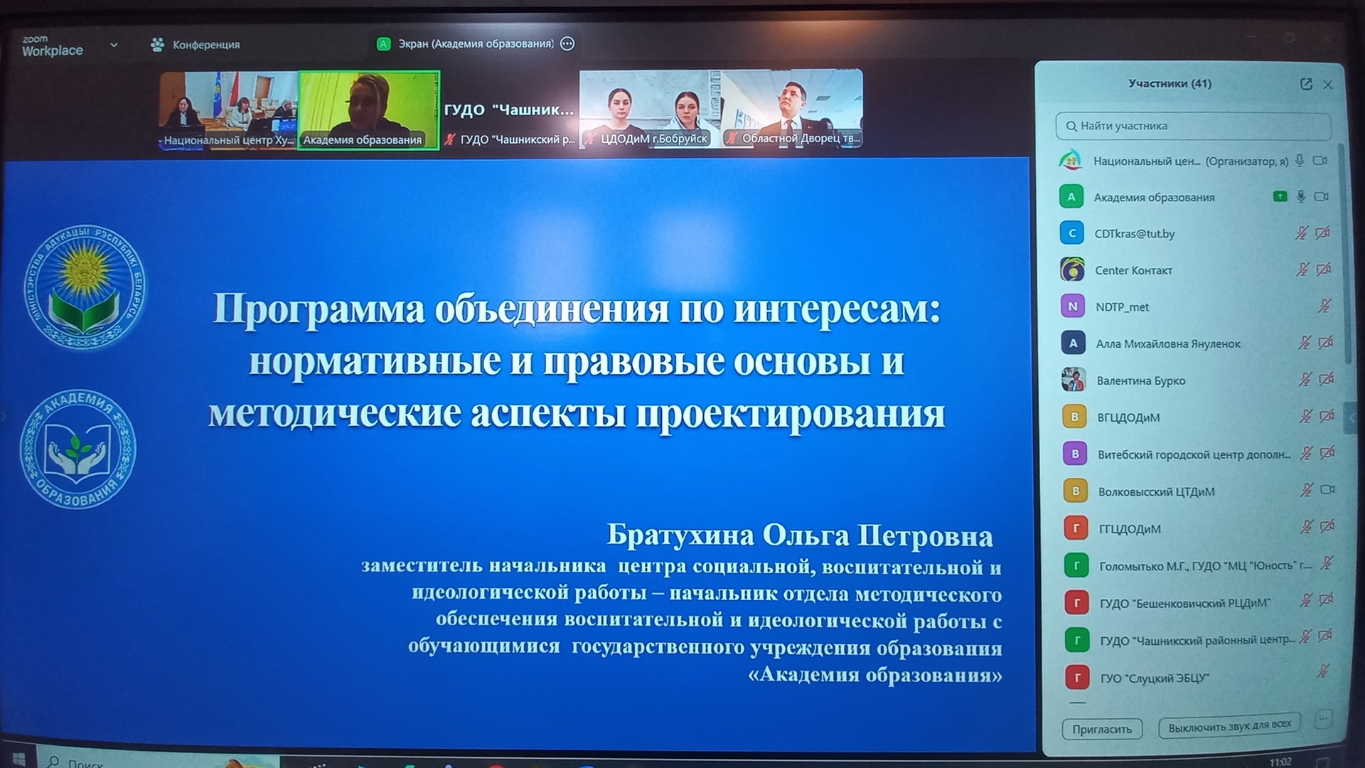 Нормативные правовые основы и методические аспекты проектирования программ объединений по интересам представила Братухина Ольга Петровна, заместитель начальника центра социальной, воспитательной и идеологической работы – начальник отдела методического обеспечения воспитательной и идеологической работы с обучающимися ГУО «Академия образования».
