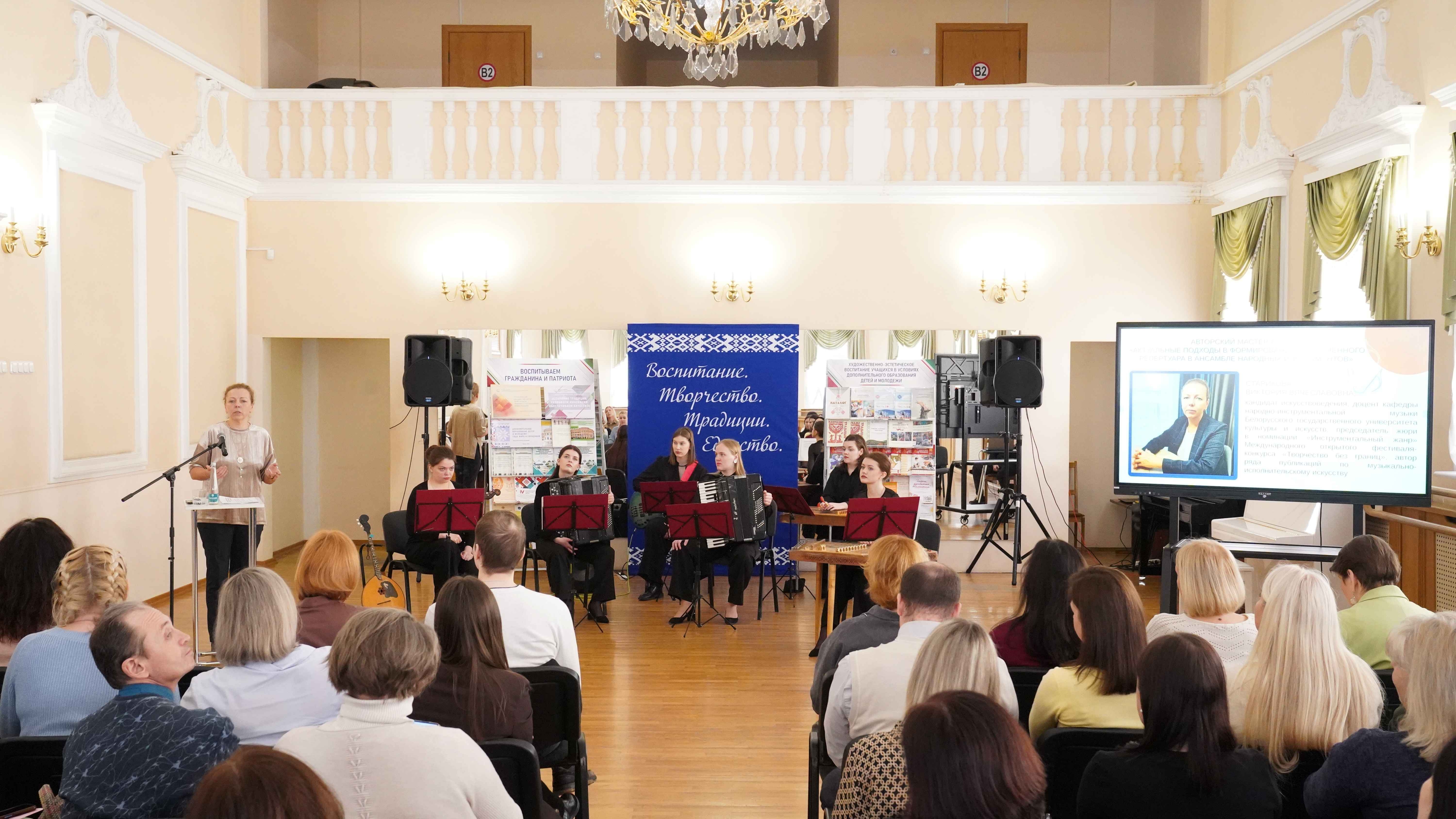 ● авторский мастер-класс «Актуальные подходы в формировании современного репертуара в ансамбле народных инструментов» Стариковой Виктории Вячеславовны, кандидата искусствоведения, доцента кафедры народно-инструментальной музыки Белорусского государственного университета культуры и искусств, председателя жюри в номинации «Инструментальный жанр» Международного открытого фестиваля-конкурса «Творчество без границ», автора ряда публикаций по музыкально-исполнительскому искусству.