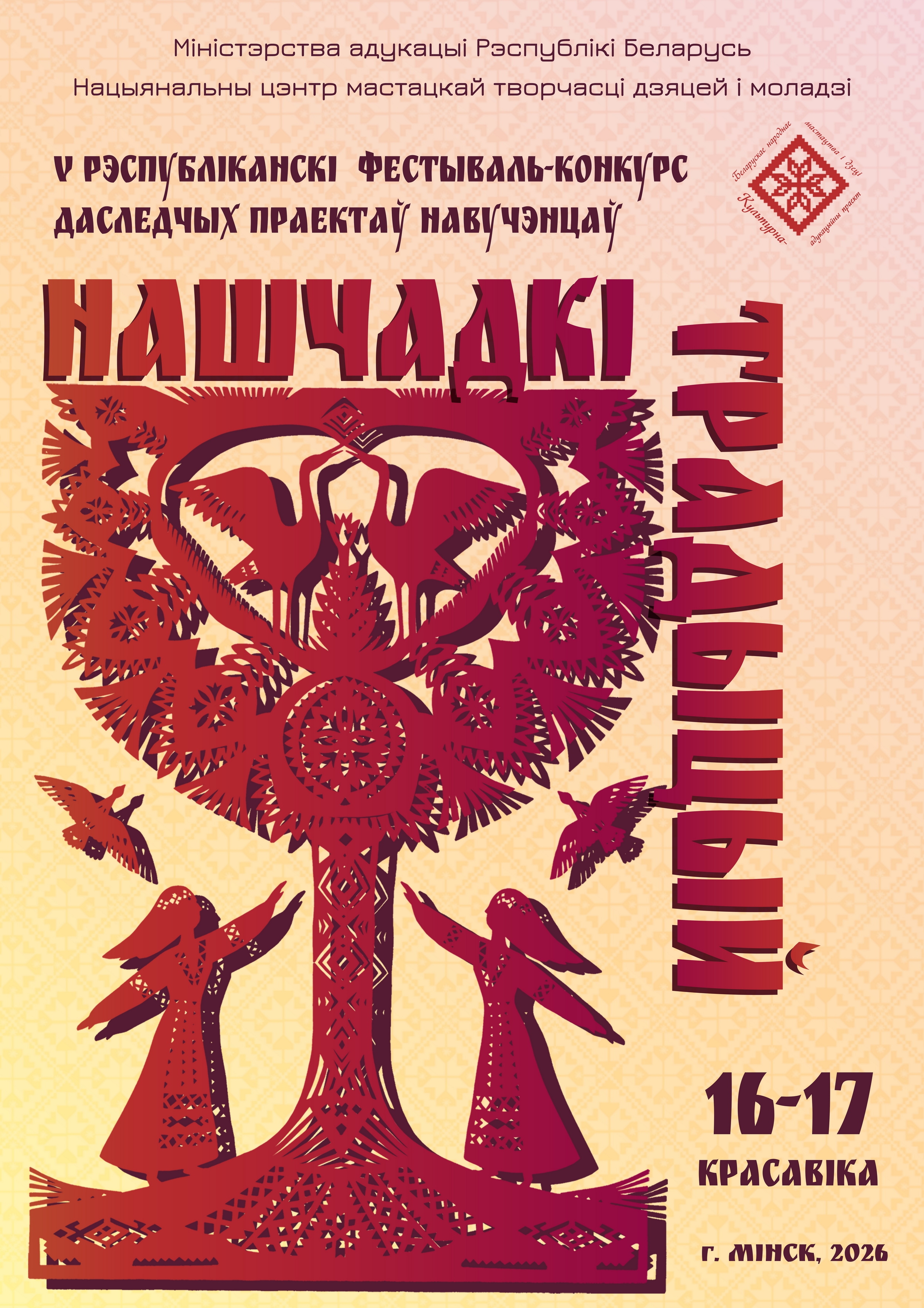 У адпаведнасці з планам работы Міністэрства адукацыі Рэспублікі Беларусь на 2026 год у Нацыянальным цэнтры мастацкай творчасці дзяцей і моладзі 16-17 красавіка 2026 года адбудуцца заключныя мерапрыемствы V Рэспубліканскага фестывалю-конкурсу даследчых праектаў навучэнцаў “Нашчадкі традыцый”.