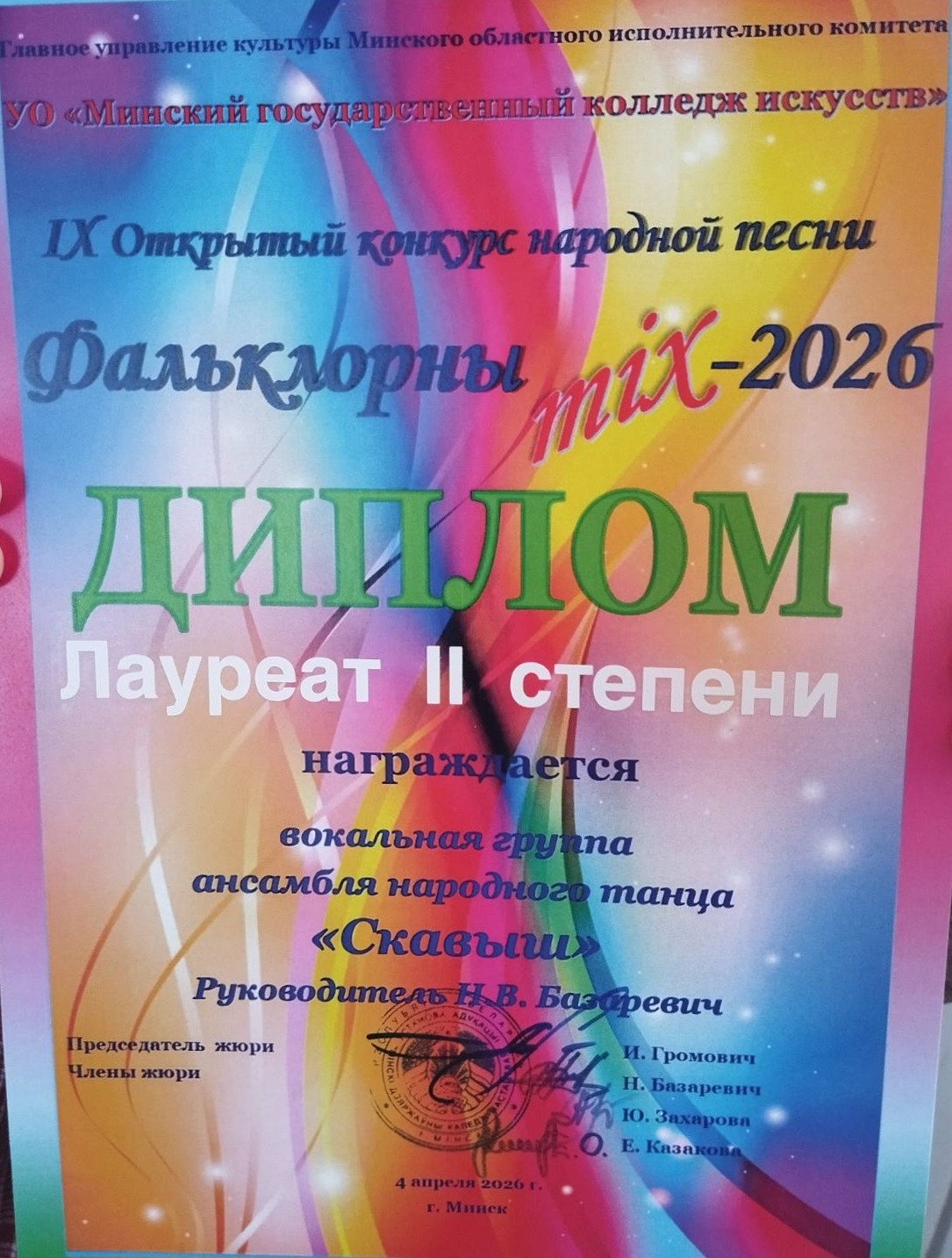 Поздравляем вокальную группу ансамбля народного танца «Скавыш» (педагоги Толоцкая Е.Н., Базаревич Н.В.) с победой и дипломом лауреата II степени на конкурсе «Фальклорны mix – 2026», проходившем в г. Минске 4 апреля 2026 года.
