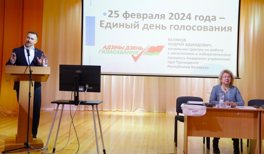 В рамках встречи коллектив Национального центра проинформирован о новациях электоральной кампании 2024, совершенствовании избирательного законодательства, истории избирательного процесса в независимой Беларуси и мировой практике проведения выборов.