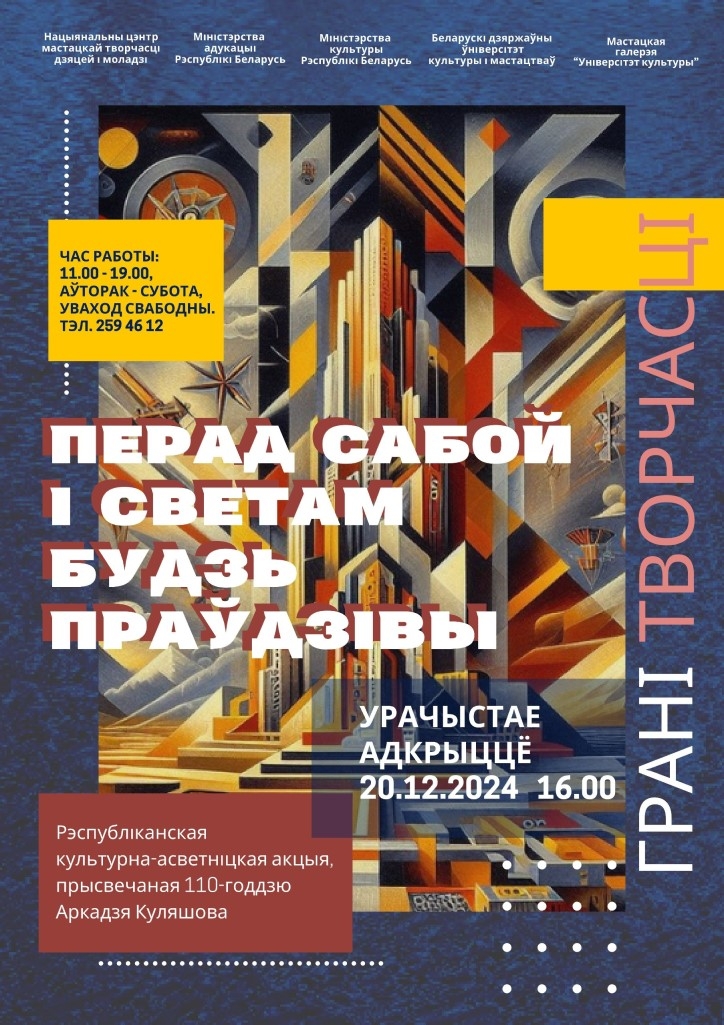 20 снежня 2024 года ў 16.00 у мастацкай галерэі “Універсітэт культуры” адбудзецца ўрачыстае адкрыццё Рэспубліканскай выставы “ГРАНІ ТВОРЧАСЦІ”.