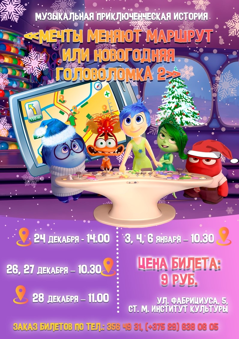 Вас ждет яркая музыкальная история с персонажами анимационного фильма «Головоломка 2», встреча с главными героями Нового года, динамичная и зажигательная игровая программа у елки, веселые новогодние песни и танцы, поздравления от главного волшебника зимы Деда Мороза, новогодняя атмосфера и хорошее настроение, большая сцена, живой звук.