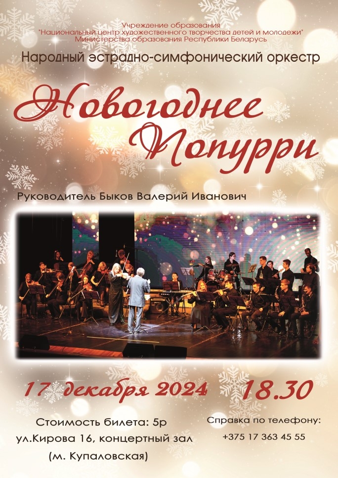 Приглашаем любителей музыки 17 декабря 2024 года в Национальный центр художественного творчества детей и молодежи на концертную программу «НОВОГОДНЕЕ ПОПУРРИ» народного эстрадно-симфоническогого оркестра под управлением Валерия Быкова. Гарантируем снегопад творчества, музыкальную  метель и чудесное зимнее настроение!