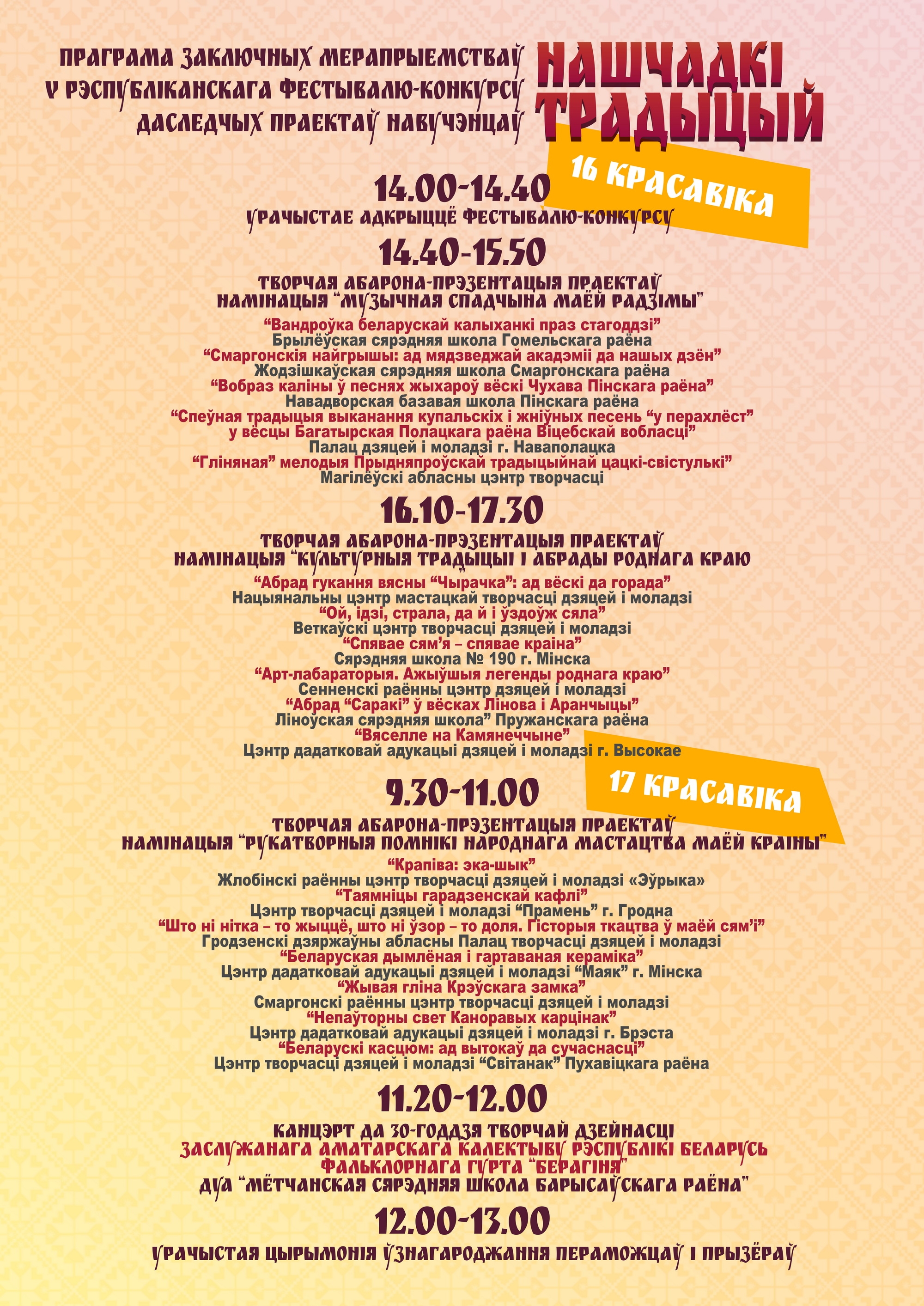 У адпаведнасці з планам работы Міністэрства адукацыі Рэспублікі Беларусь на 2026 год у Нацыянальным цэнтры мастацкай творчасці дзяцей і моладзі 16-17 красавіка 2026 года адбудуцца заключныя мерапрыемствы V Рэспубліканскага фестывалю-конкурсу даследчых праектаў навучэнцаў “Нашчадкі традыцый”.